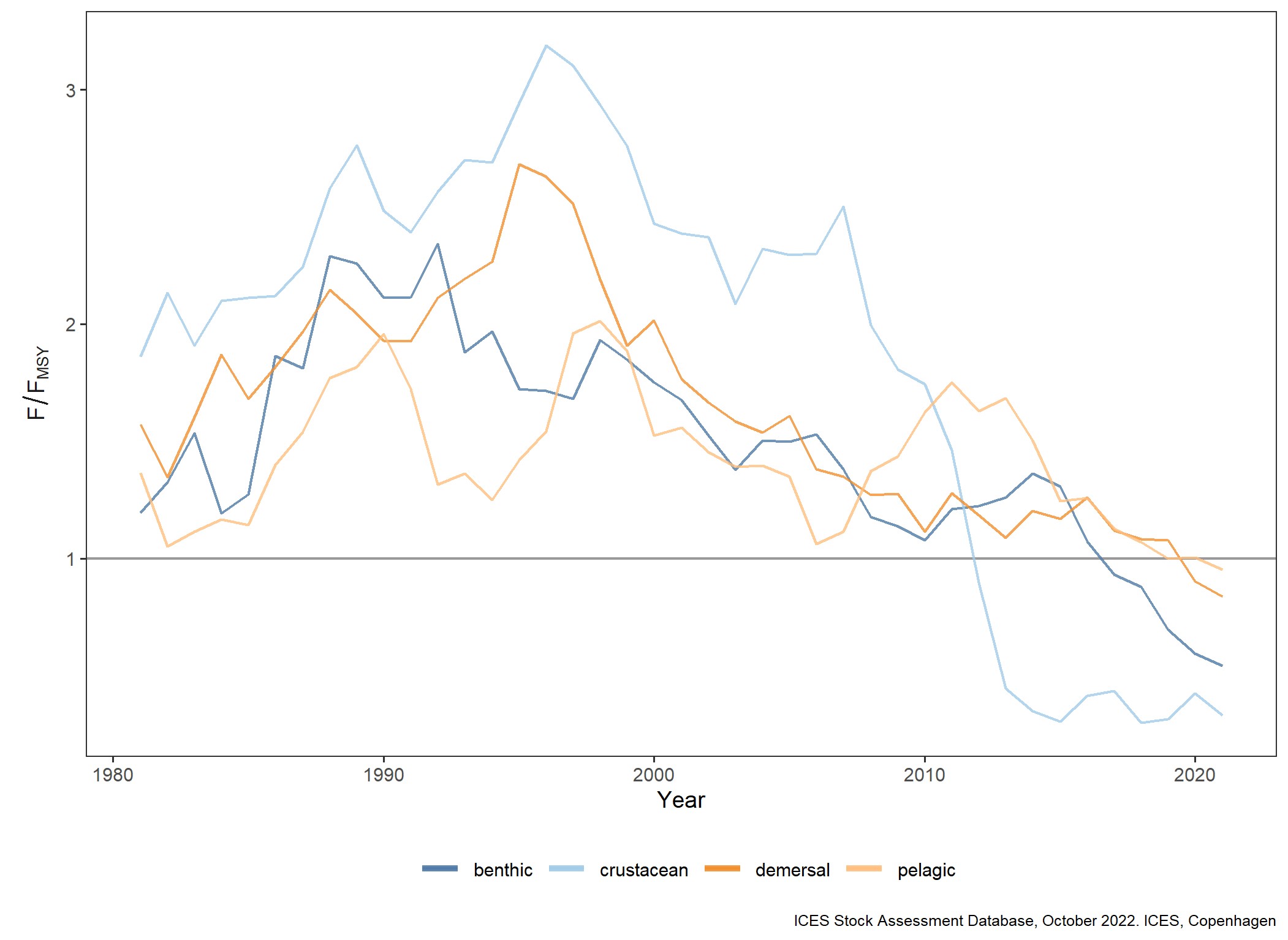 Figure 4 shows the historical evolution of fishing mortality relative to reference points by fish guild in the Bay of Biscay and the Iberian Coast ecoregion. A general decrease in fishing effort in the region (in many cases because of a reduction in the fleet) has contributed to an overall decline in the fishing mortality (F) of commercial fish stocks since 1988. The mean F is now closer to the level that produces maximum sustainable yield (MSY).