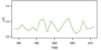 Indicators like the large fish indicator (LFI) index (describing the proportion – by weight – of the demersal fish community on survey catch larger than regional length thresholds) can be used to monitor changes in the fish populations. In the Bay of Biscay, the LFI index has shown a positive temporal trend since the year 2000 (Figure 5).
