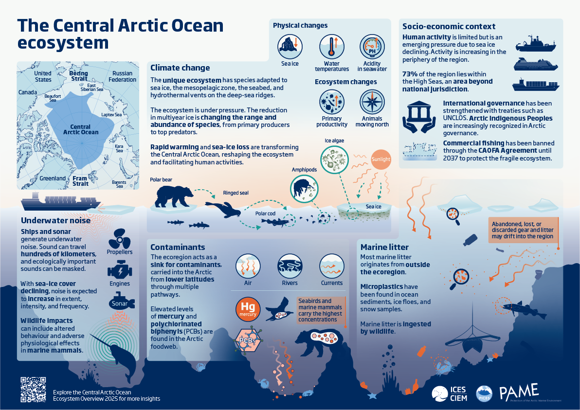As the Arctic warms faster than any other region on Earth, understanding its fragile ecosystems has never been more urgent. This year marks the tenth anniversary of the Working Group on the Integrated Ecosystem Assessment of the Central Arctic Ocean (WGICA), a broad international collaboration that brings together scientists, knowledge, and results from working groups of the North Atlantic (ICES), North Pacific (PICES), and the Arctic Council (PAME, CAFF, and AMAP). WGICA's mission is to study and understand the changing Central Arctic Ocean (CAO) ecosystem, from the Pacific Bering Strait, across the Central Arctic Ocean, and to the Atlantic Fram Strait.